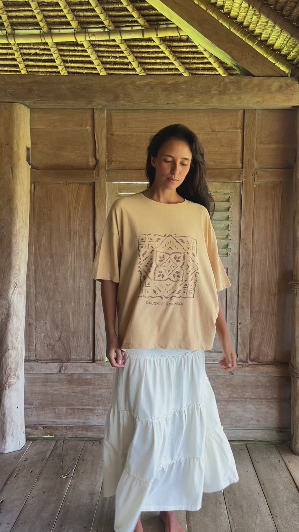 Woman wearing the Daughters of India Shanti Tee in Cashew, an oversized cream linen-cotton blend t-shirt with block print design, paired with a white skirt