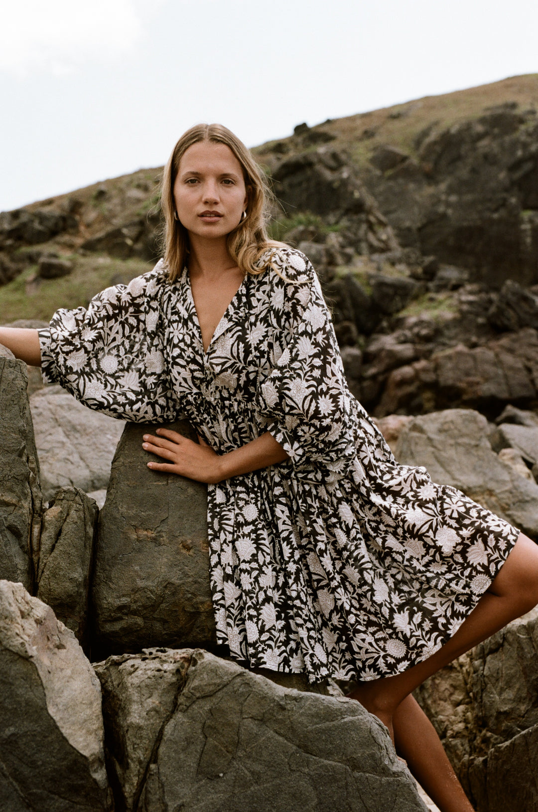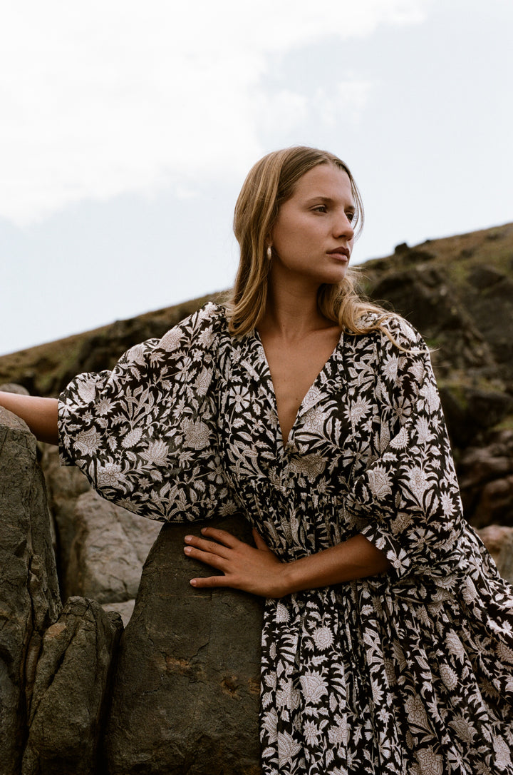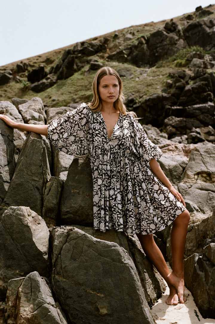 Pepper is such a vibe, effortlessly blending bohemian style with elegance. The bold black-and-white floral pattern creates a striking look that stands out in any setting, while the loose, flowy silhouette keeps it comfortable and easy to wear. Its soft fabric and relaxed fit make it perfect for a beach day, outdoor adventures, or casual outings. The voluminous sleeves and gathered waistline add just the right touch of femininity. Whether paired with sandals or barefoot by the rocks, this dress radiates carefree, natural beauty with a timeless, laid-back charm