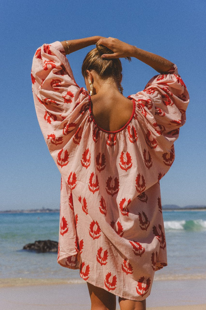 The Ria Mini Dress has been ethically handcrafted with 100% cotton into the most comfortably soft, billowing silhouette. Featuring an adjustable gathering at the neckline with a tie, pockets, and cuffs to finish the delightfully large sleeves. Adorned with hand printed florals, the making of this dress serves to support the preservation of hand craftsmanship and women empowerment in India.